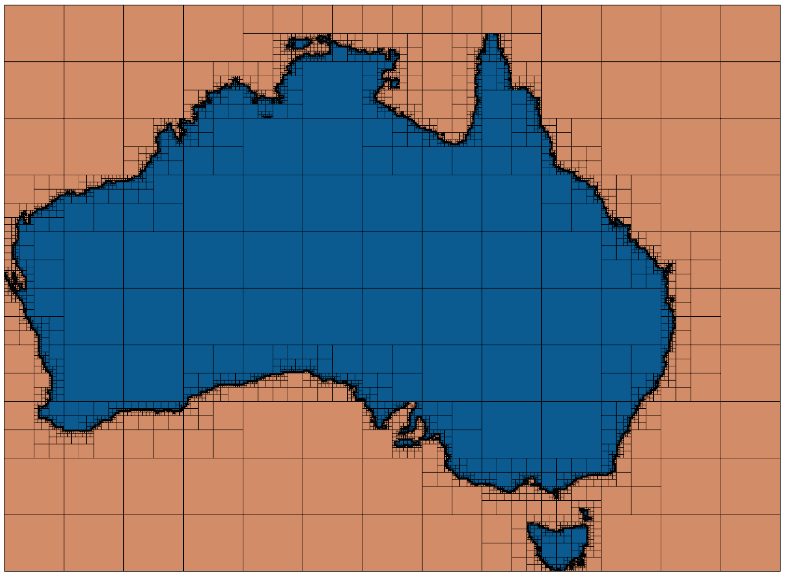 Two-region AMR mesh generated by the Shaper miniapp from successive adaptation to the outlines of Australia.