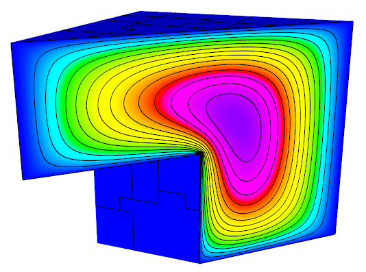 Level lines in a cutting plane of the solution from the parallel version of Example 1 on 64 processors with fichera.mesh. Visualization with GLVis.