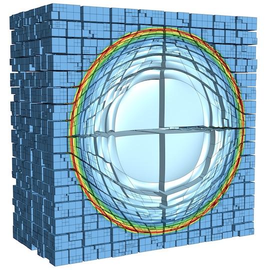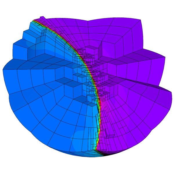 Anisotropic refinement in a 3D version of the AMR test. Portion of the spherical domain is cut away in GLVis.