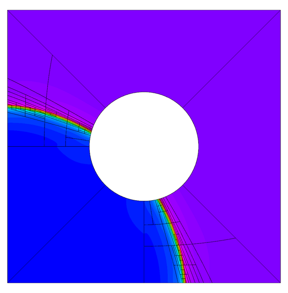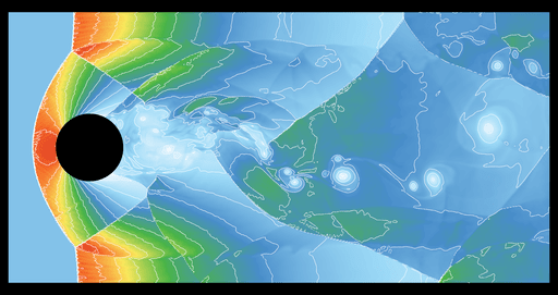 Compressible Euler equations, Mach 3 flow around a cylinder in 2D, stabilized DG-P1 spacial discretization. Image courtesy of Hennes Hajduk, as part of the 2021 MFEM Workshop Visualization Contest.