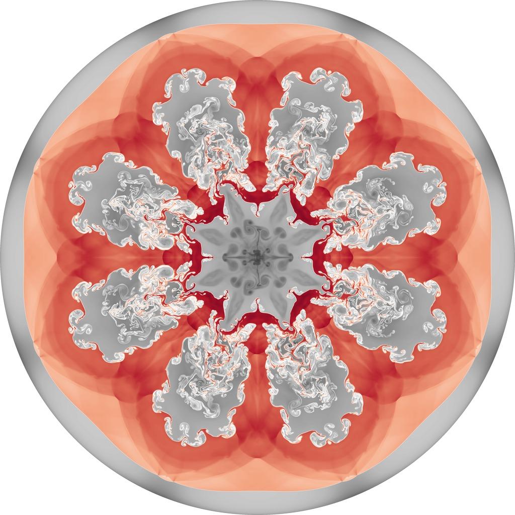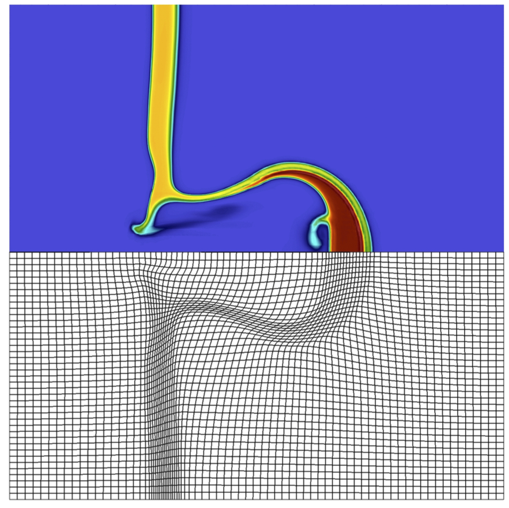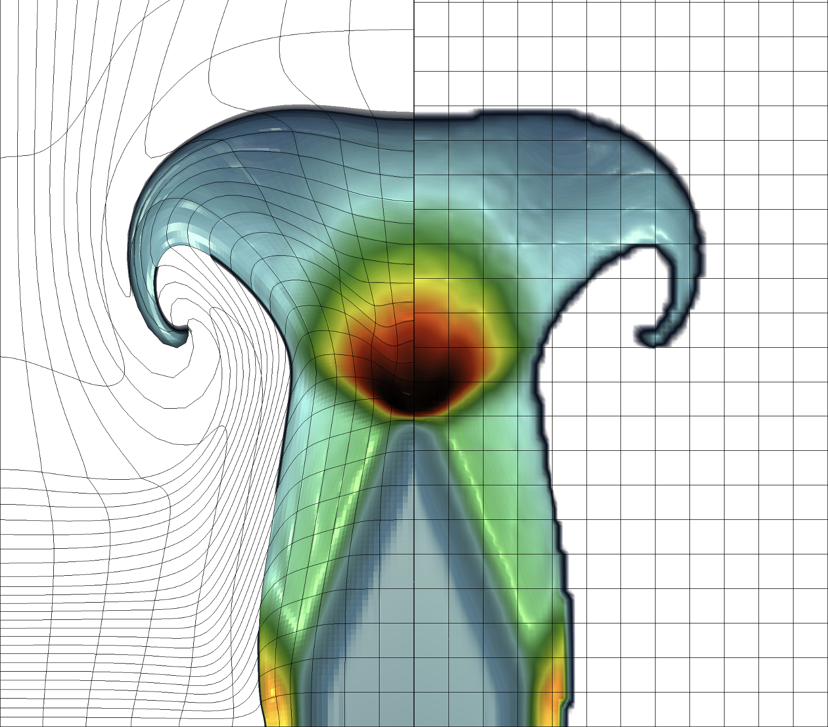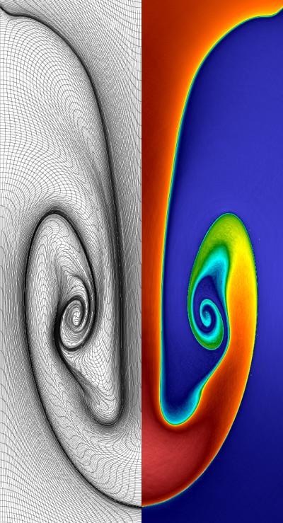 Conservative and bounded remap of Lagrangian hydrodynamics to a uniform mesh with Laghos and Remhos. Image courtesy of Vladimir Tomov, as part of the 2025 MFEM Workshop Visualization Contest.