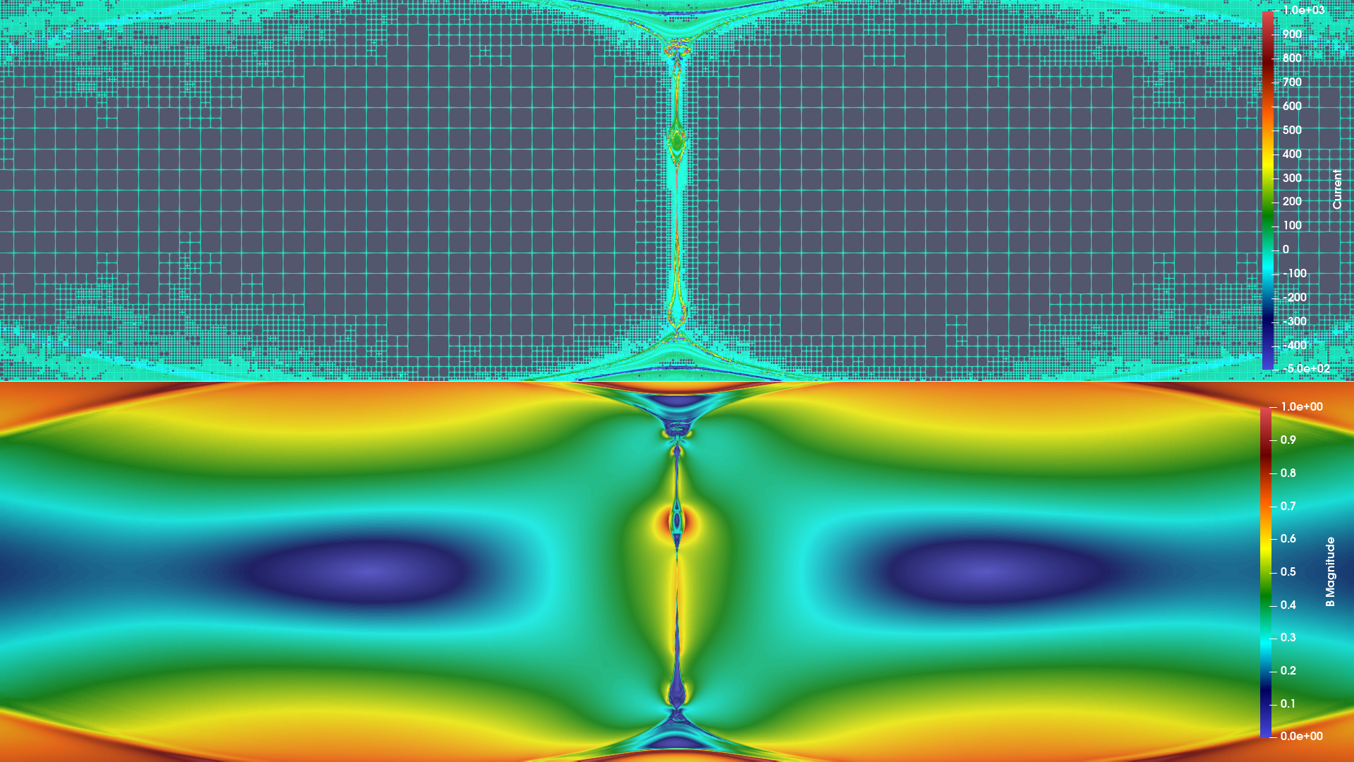 π¬ Adaptive, implicit resistive MHD solver (from TDS-SciDAC) resolves multi-scale features of plasmoid instability.