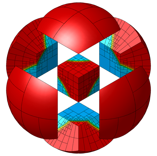 π¬ Layered spherical shell compressed by half-elliptical beams, modeled as a nonlinear Neo-Hookean solid. Contact constraints are provided by Tribol, enforced with an Interior Point method, and linear systems solved by AMGF-preconditioned PCG. Image courtesy of Socratis Petrides, as part of the 2025 MFEM Workshop Visualization Contest.