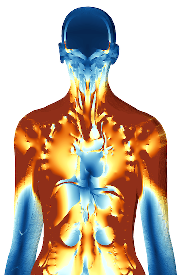 Electric field induced by an MRI gradient coil in a human body. Simulation by the Magnetic Resonance Physics and Instrumentation Group at Harvard Medical School.