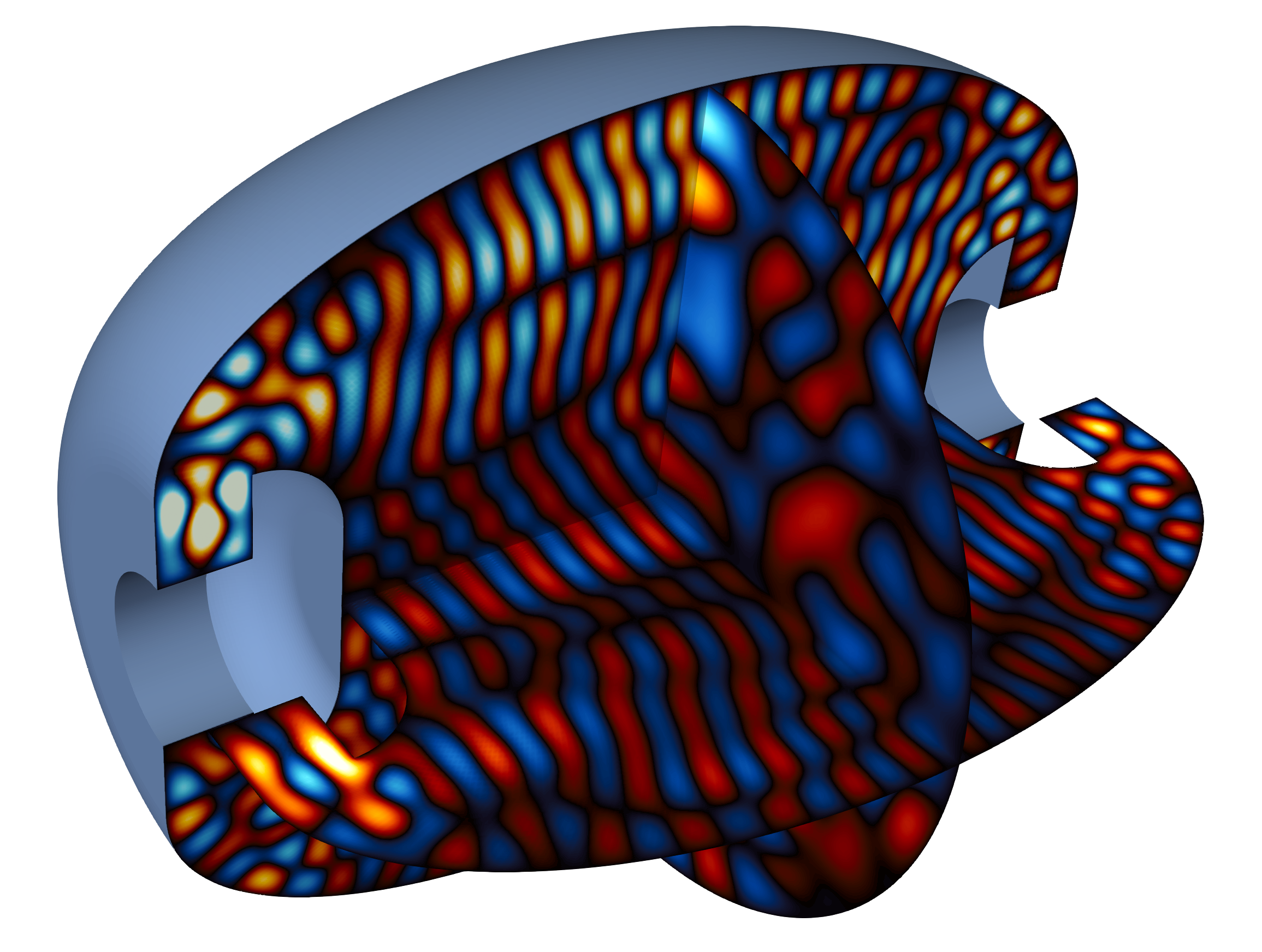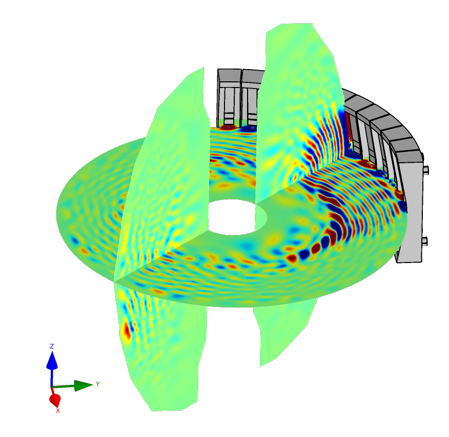 Slice image of the high harmonic fast wave propagation in the NSTX-U magnetic fusion device. Computed using MFEM's 4th order H(curl) elements by the RF-SciDAC project.