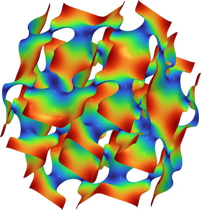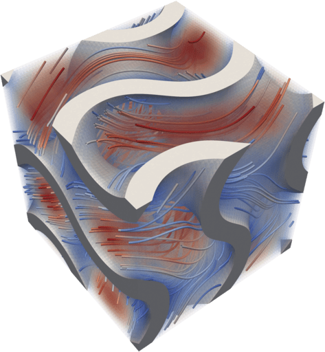 Flow through periodic Gyroid micro-cell, MFEM Navier mini-app with additional Brinkman penalization. Image courtesy of Mathias Schmidt, as part of the 2022 MFEM Workshop Visualization Contest.