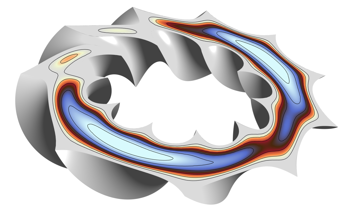 Cut image of the solution from Example 1 on a sharply twisted, high order toroidal mesh. The mesh was generated with the toroid miniapp.