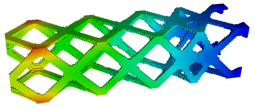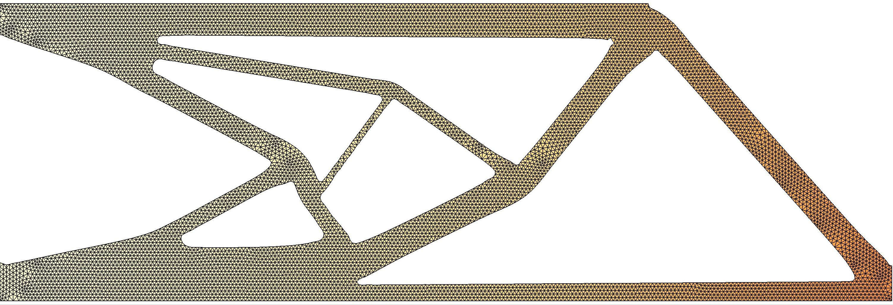 π¬ Topology optimization with conformal meshes to maximize beam stiffness under a downward force on the right wall. Image courtesy of Ketan Mittal and Mathias Schmidt, as part of the 2023 MFEM Workshop Visualization Contest.