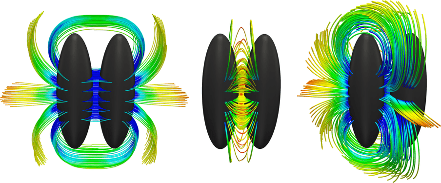 Streamlines of the magnetic field from a parallel computation of the magnetostatic interaction of two magnetic orbs. Visualization with VTK.