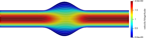 Viscoelastic flow of blood through an artery with aneurysm modeled by the Hookean dumbbell model discretized with BCF-method (Navier-Stokes+SUPG). Image courtesy of Andreas Meier, as part of the 2021 MFEM Workshop Visualization Contest.