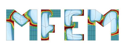 A version of the MFEM logo demonstrating curvilinear elements, adaptive mesh refinement and (idealized) parallel partitioning. Visualization with GLVis.