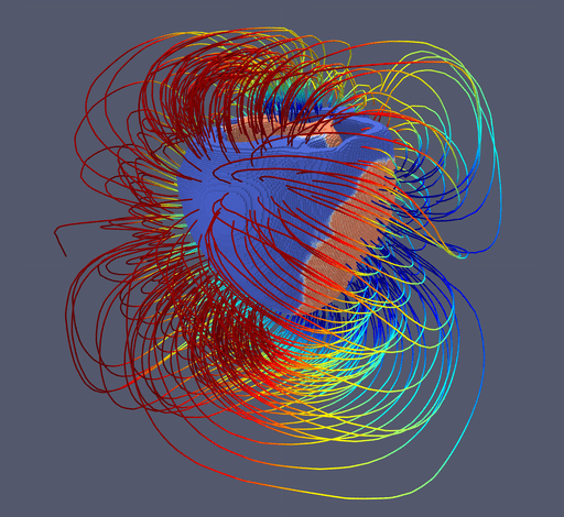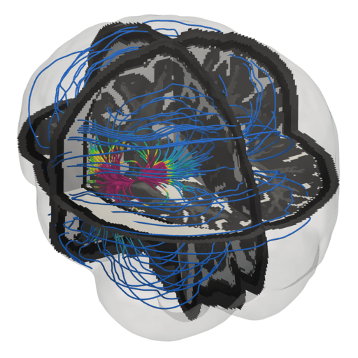 Streamlines of the electric field generated by a current dipole source located in the temporal lobe of an epilepsy patient. Image courtesy of Ben Zwick, winner of the 2022 MFEM Workshop Visualization Contest.