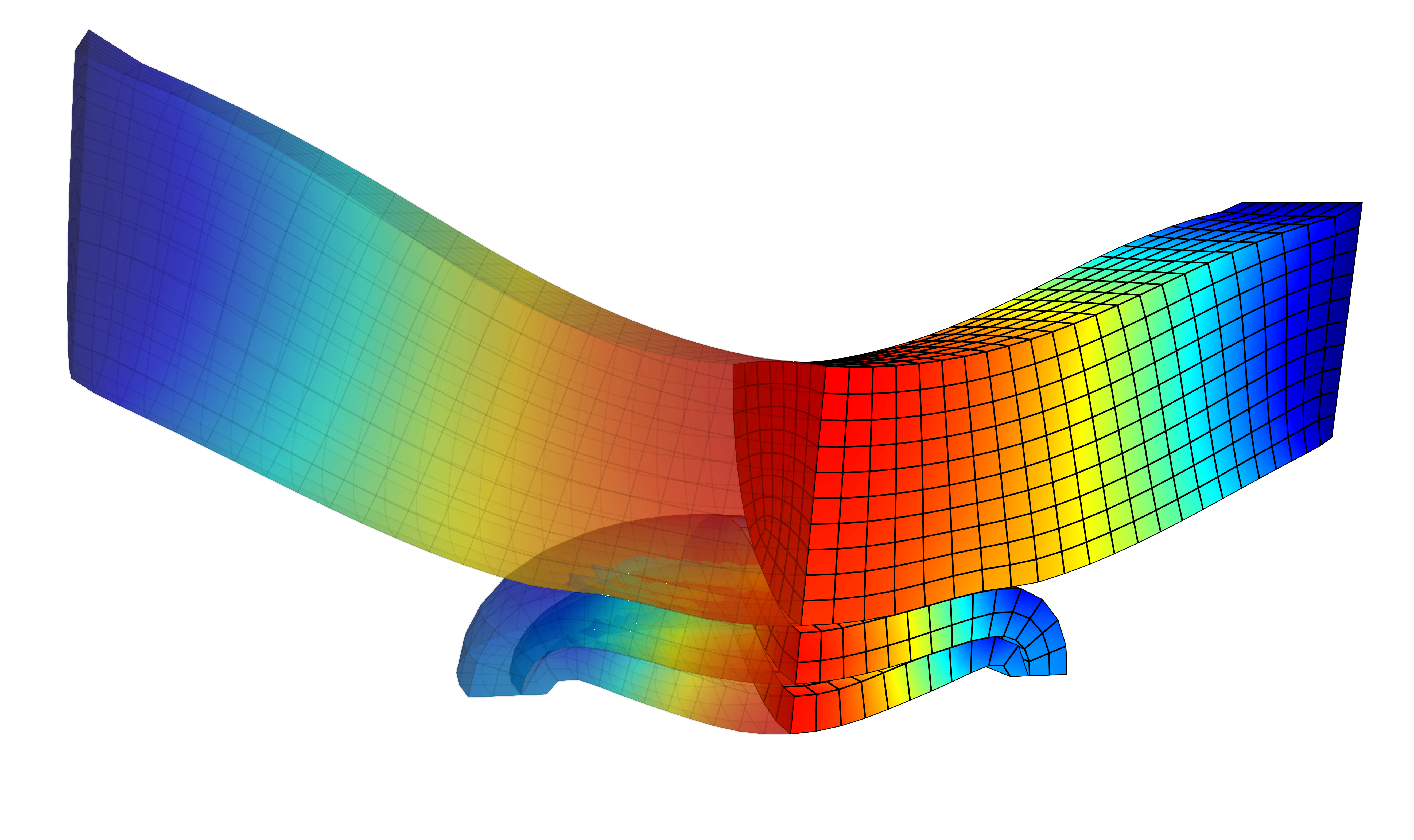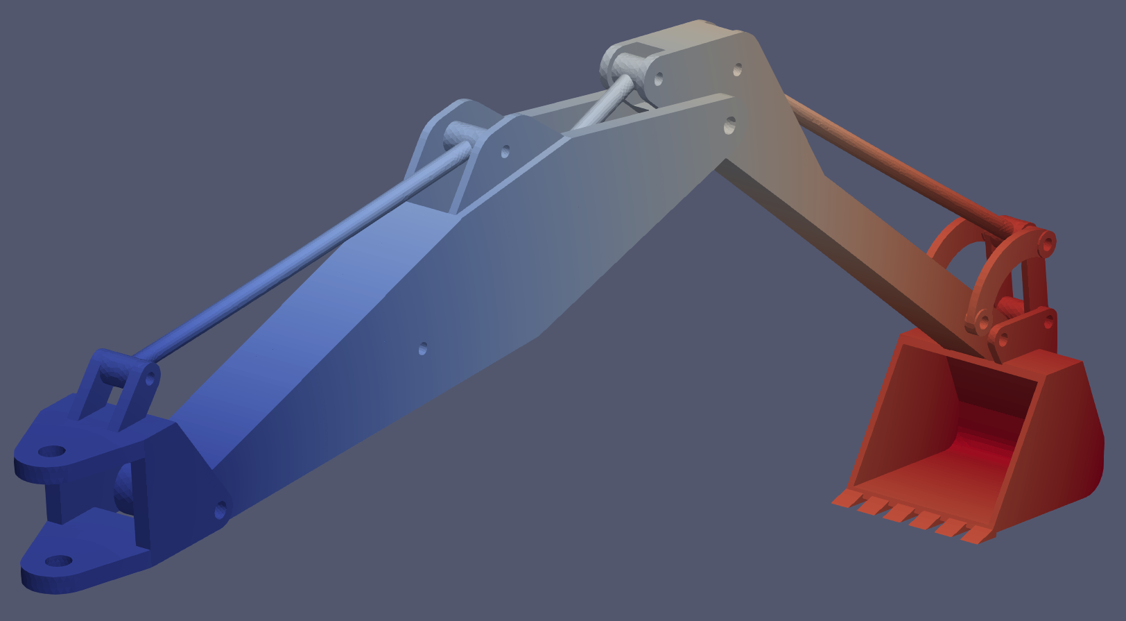 Displacement distribution of a loaded excavator arm under static equilibrium using MFEM's API in an external library. Image courtesy of Mehran Ebrahimi, winner of the 2023 MFEM Workshop Visualization Contest.