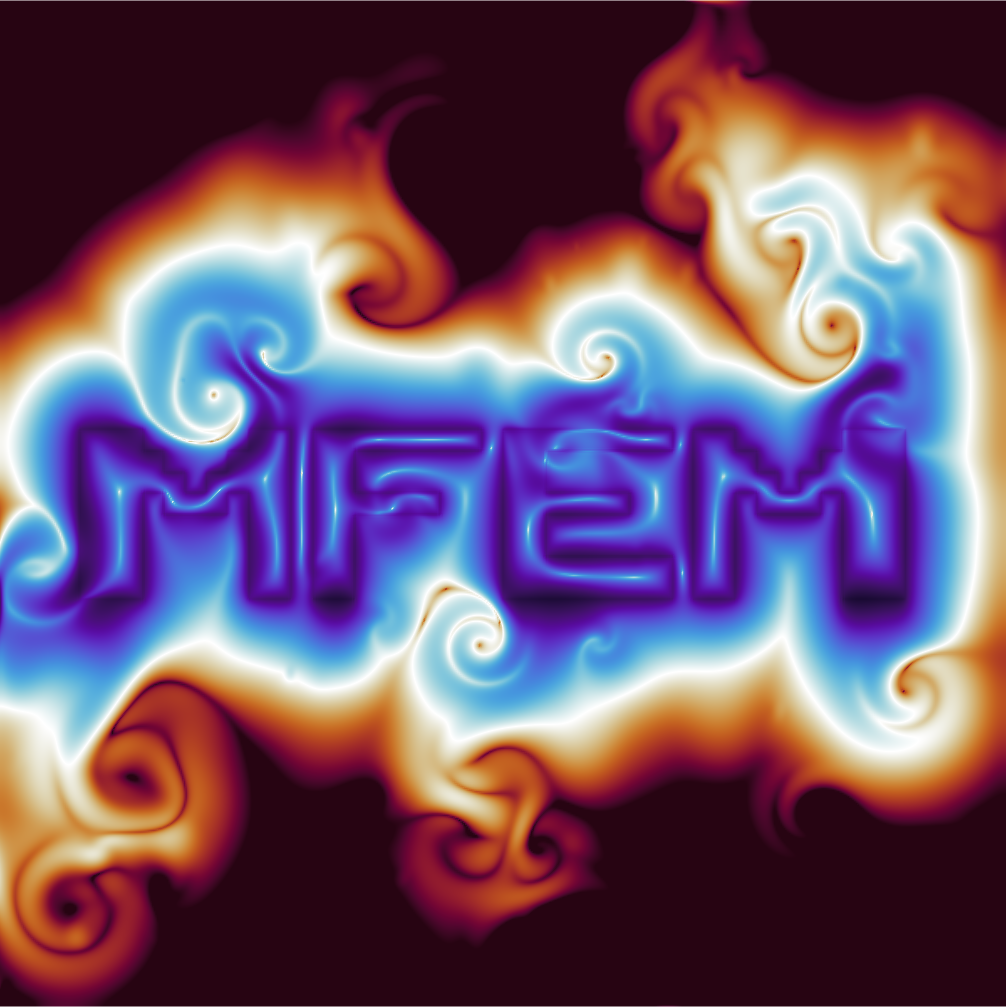Heat flux magnitude in a convection - (anisotropic) diffusion simulation with MFEM text as the initial temperature profile. A single implicit step of the HDG scheme was used. Image courtesy of Jan Nikl, winner of the 2024 MFEM Workshop Visualization Contest.