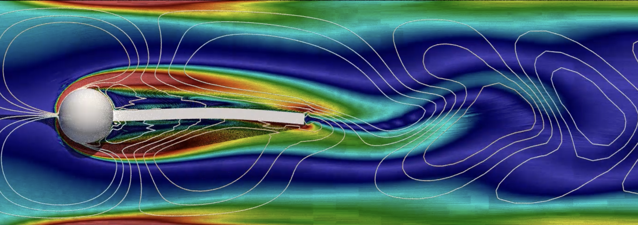 π¬ Visualization of a two-dimensional incompressible flow past a cylinder with an attached deformable elastic beam. The simulation uses a strongly coupled partitioned fluid-structure interaction (FSI) solver. Image courtesy of Leonardo Molinari as part of the 2025 MFEM Workshop Visualization Contest.