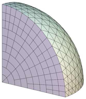 This miniapp generates a circular sector mesh that consist of quadrilaterals and triangles of similar sizes. The 3D version of the mesh is made of prisms and tetrahedra: