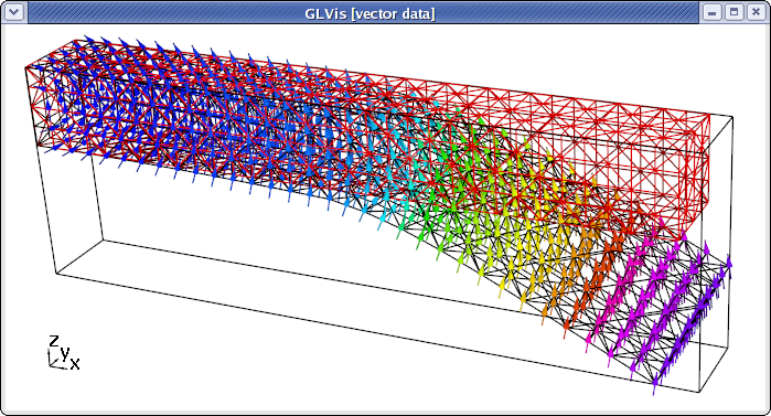To visualize the entire vector field, type "fooogtevv" instead, which will use uniform sized arrows colored according to their magnitude. Here is the corresponding plot from "ex3 -m ../data/beam-hex.mesh":