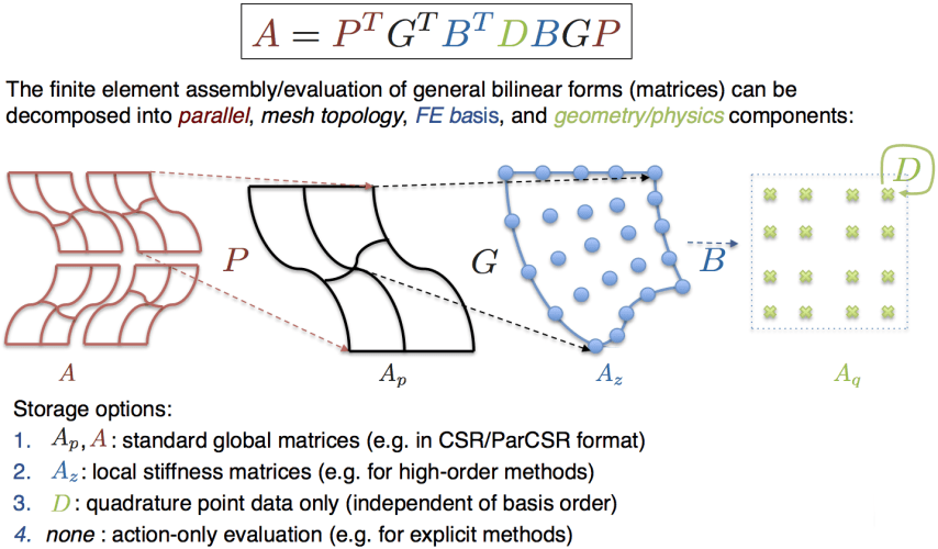 MultUnassembled: matrix-free action using the mesh nodes and the input vector.Assemble,MultAssembled: partial assembly and operator action using the partially assembled data at quadrature points and the input vector.AssembleMatrix(DenseTensor &): assemble the local element matrices and store them asDenseTensor.AssembleMatrix(SparseMatrix &): assemble the operator in a global (CSR)SparseMatrix.AssembleBilinearForm(BilinearForm &): assemble element matrices and add them to the bilinear form.