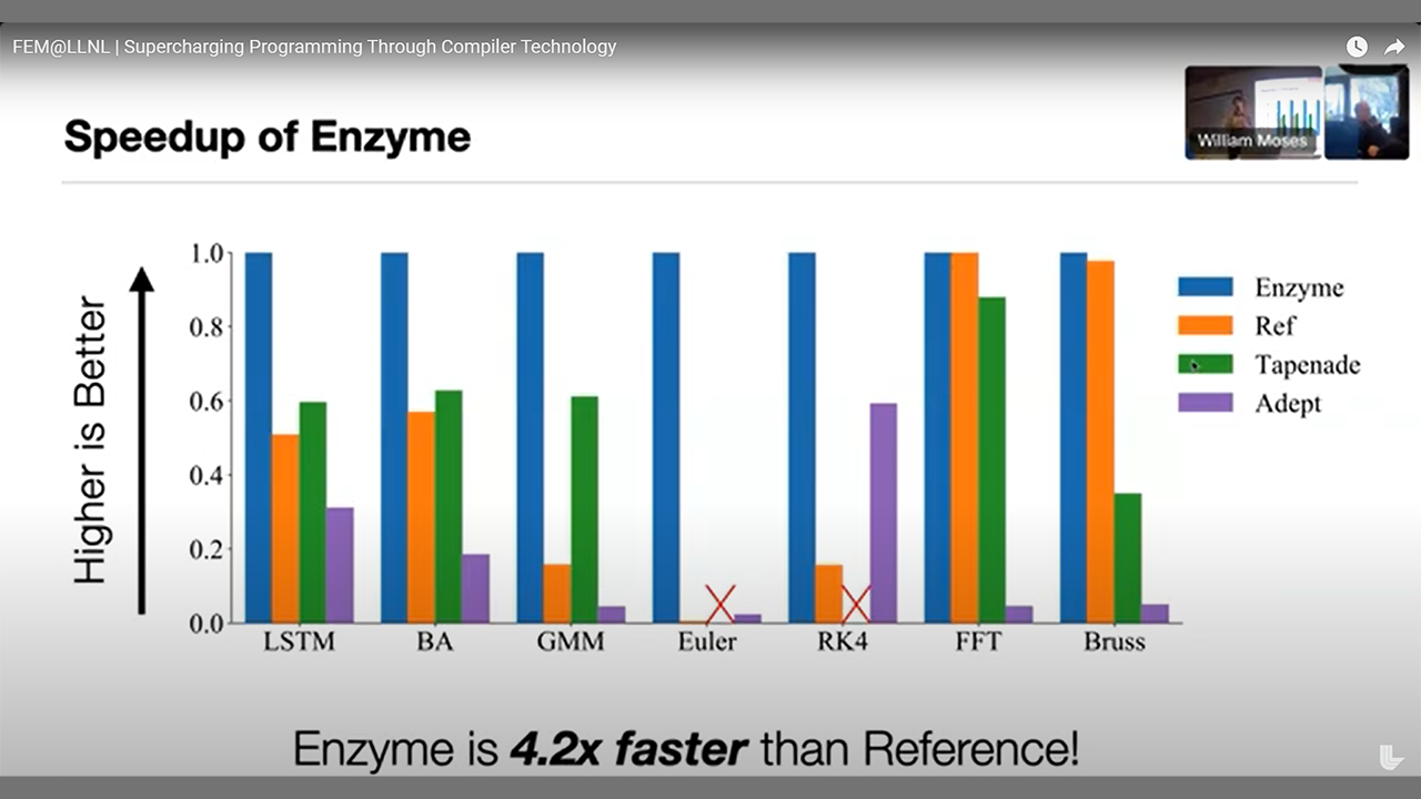 Jamie Bramwell of LLNL presented an overview of the open-source Serac project, whose goal is to provide user-friendly abstractions and modules that enable rapid development of complex nonlinear multiphysics simulation codes. She provided an overview of both the high-level physics modules (thermal conduction, solid mechanics, incompressible flow, electromagnetics) as well as the serac::Functional framework for quickly developing nonlinear GPU-enabled finite element method kernels.
