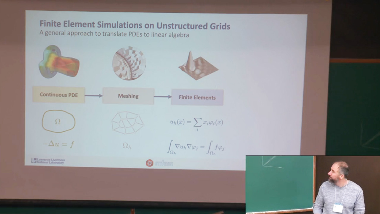 For users unfamiliar with MFEMâs solver library, Will Pazner of LLNL demonstrated a few waysâin some cases adding just a single line of codeâto run scalable solvers for differential equations. These solvers execute hierarchical finite element discretizations for both low- and high-order problems.