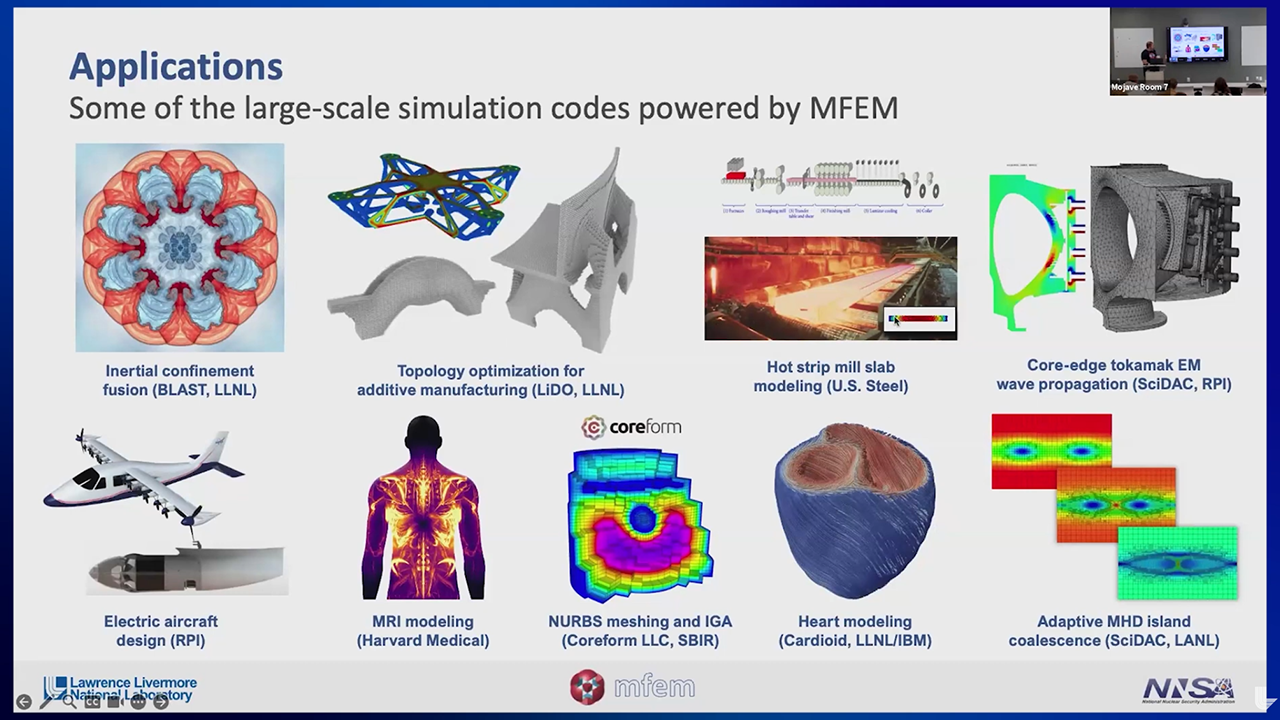 Devlin Hayduke of ReLogic Research presented "Project Minerva: Accelerated Deployment of MFEM Based Solvers in Large Scale Industrial Problems." While many Advanced Scientific Computing Research (ASCR) supported software packages are open source, they are often complicated to use, distributed primarily in source-code form targeting HPC systems, and potential adopters lack options for purchasing commercial support, training, and custom-development services. In response to this need, ReLogic Research, Inc., in collaboration with LLNL, is developing a secure, cloud deployable platform based on the MFEM software termed Minerva. Minerva will feature an integration layer allowing users of commercially available finite element pre/post-processing software (e.g., Abaqus/CAE, Hypermesh, Femap) for use with the Abaqus solver to run simulation studies with the MFEM discretization library and will strengthen further MFEM implemented solvers to make them applicable for solving large scale industrial design and optimization problems.