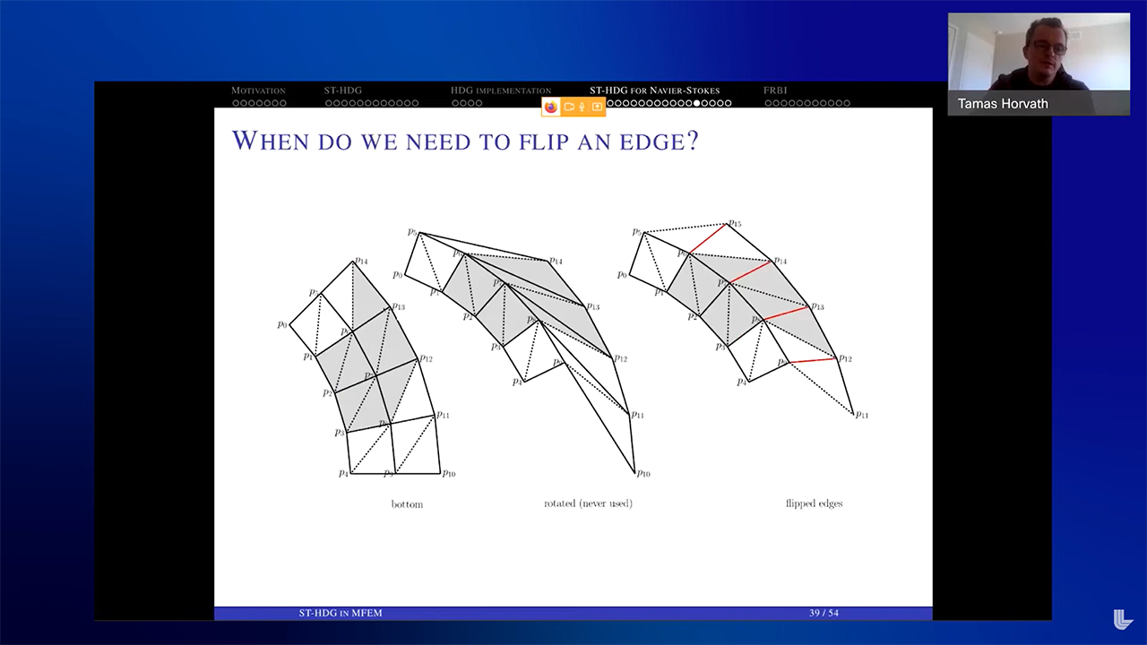 Marc Bolinches from the University of Texas at Austin described a compressible Navier-Stokes solver using MFEM v4.2 which did not include full support for GPUs. The solver uses the discontinuous Galerkin (DG) method as a space discretization and an explicit Runge-Kutta time-integration scheme. An effort has been made to fully support GPU computation by taking over some of the loops internal to the NonLinearForm class. This has also allowed us to implement overlap between computation and communication. The team hopes their open-source code will help other researchers in creating high-fidelity simulations of compressible flows.