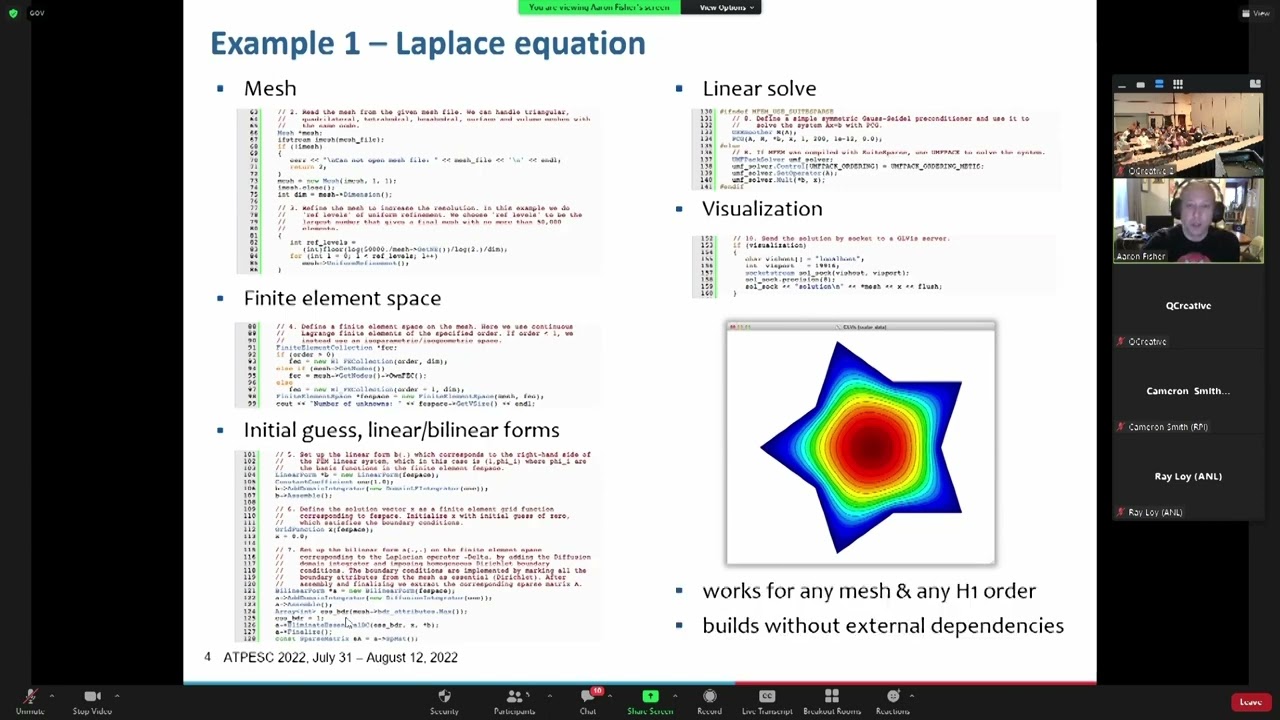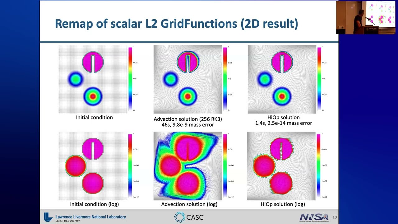 For users unfamiliar with MFEMâs solver library, Will Pazner of LLNL demonstrated a few waysâin some cases adding just a single line of codeâto run scalable solvers for differential equations. These solvers execute hierarchical finite element discretizations for both low- and high-order problems.