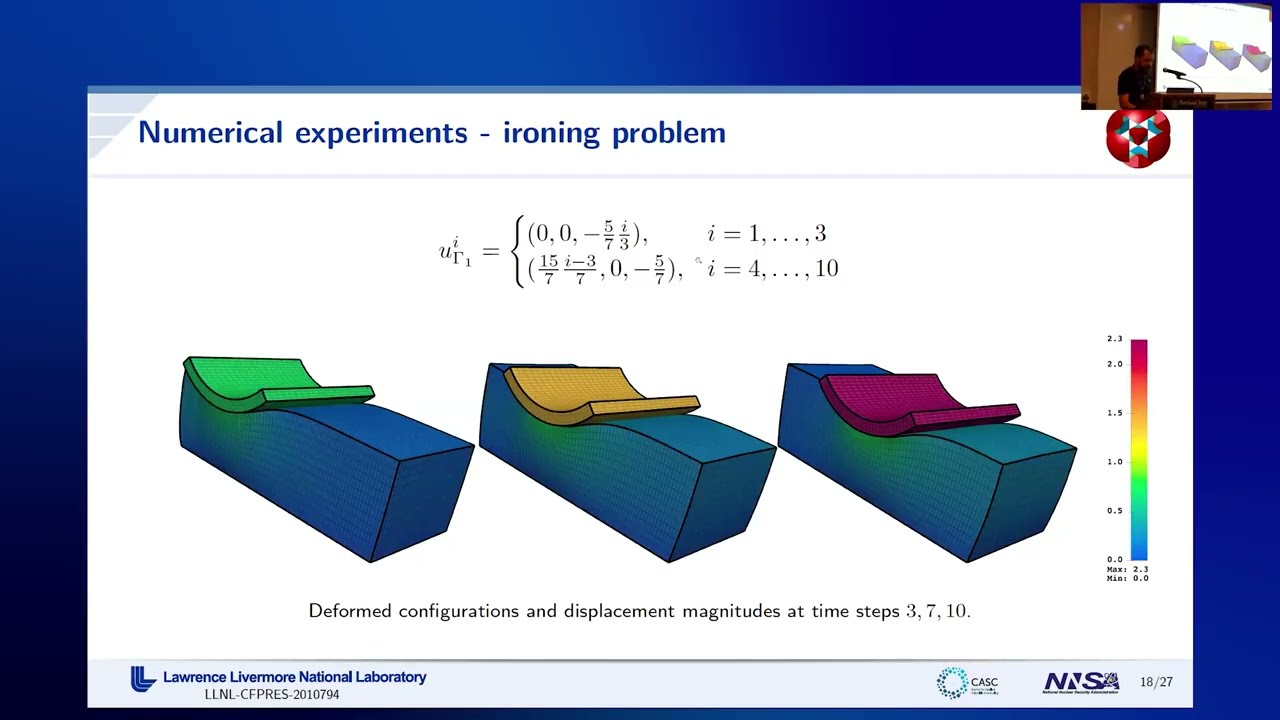 Siu Wun Cheung of LLNL presented "Reduced Order Modeling for Finite Element Simulations Through the Partnership of MFEM and libROM." MFEM provides a wide variety of mesh types and high-order finite element discretizations. However, subject to the model complexity and fine resolution of the discretization, the computational cost can be high, requiring a long time to complete a single forward simulation. In this talk, we will introduce various reduced order modeling techniques, which aim to lower the computational complexity and maintain good accuracy, including intrusive projection-based model reduction and non-intrusive approaches. We will demonstrate the use of reduced order modeling techniques in libROM (www.librom.net), which can be applied to various MFEM examples, including the Poisson problem, linear elasticity, linear advection, mixed nonlinear diffusion, nonlinear elasticity, nonlinear heat conduction, Euler equation, and optimal control problems.