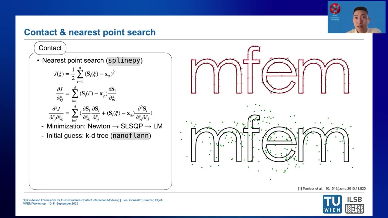 Jaewook Lee (TU Wien) presented a framework for modeling the secondary shear-zone in orthogonal cutting as a fluidâstructureâcontact interaction problem. The structural solver, built on MFEMâs NURBS discretization, is coupled to an in-house fluid solver. He highlighted how MFEMâs modular architecture enabled our spline-based extensions and their seamless integration into the coupled process. This work provides a starting point for exploring complex multiphysics phenomena in the orthogonal cutting contact zone.