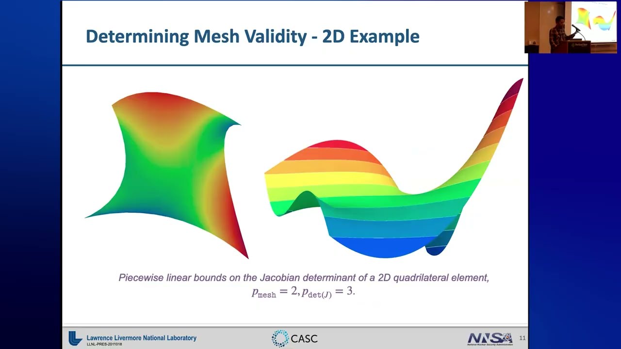 LLNL's Ketan Mittal introduced a novel method for bounding high-order multi-dimensional polynomials in finite element approximations. The method involves precomputing optimal piecewise-linear bounding boxes for polynomial basis functions, which can then be used to locally bound any combination of these basis functions. This approach can be applied to any element/basis type at any approximation order and can be evaluated efficiently on-the-fly in simulations. He also presented some recent developments to high-order mesh optimization in MFEM. These include a technique for tangential relaxation on curved boundaries, detecting mesh validity through bounds on the determinant of the Jacobian of the nodal position function, and a PDE-constrained approach for r-adaptivity that improves mesh quality to reduce error in the PDE solution.