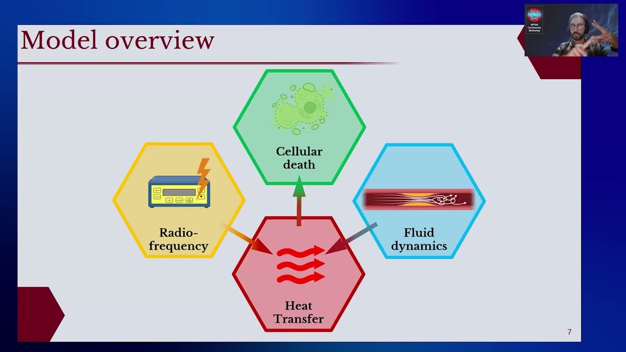 Ben Zwick of the University of Western Australia presented "Solution of the Electroencephalography (EEG) Forward Problem." The brain's electrical activity can be measured using EEG with electrodes attached to the scalp, or electrocorticography (ECoG), also known as intracranial EEG (iEEG), with electrodes implanted on the brain's surface. EEG source localization combines measurements from EEG or iEEG with data from medical imaging to estimate the location and strengths of the current sources that generated the measured electric potential at the electrodes. Source localization can be used to locate the epileptic zone in pharmaco-resistant focal epilepsies and study evoked related potentials. Accurate source localization requires fast and accurate solutions of the EEG forward problem, which involves calculating the electric potential within the brain volume given a predefined source. This presentation demonstrates how MFEM can be used to solve the EEG forward problem using patient-specific geometry and tissue conductivity obtained from medical images.