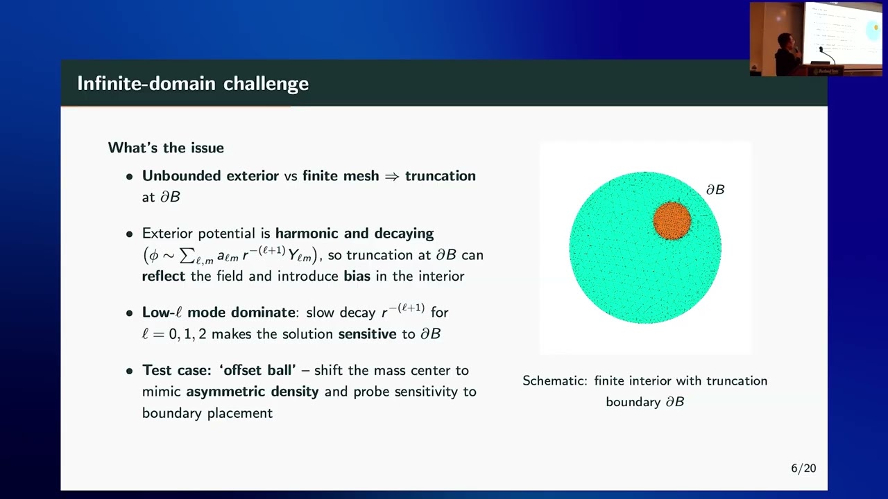 Ziheng Yu (Cambridge University) presented this research. Glacial isostatic adjustment (GIA) couples solid-Earth deformation, self-gravitation, and sea-level changeâbut the gravitational potential lives on an unbounded exterior, while our meshes do not. This talk presented MFEM-based treatments that bring the âinfinite domainâ into finite computations with controlled accuracy and stability. Yu outlined a compact, linearized GIA formulation (an elasticityâgravity core with optional rotation, sea level, and viscoelastic effects) and focus on three exterior closures for self-gravitation: (1) a Dirichlet-to-Neumann operator that enforces the exact exterior decay on a spherical outer boundary; once computed, it can be reused across solves and iterations; (2) a multipole continuation that represents the exterior field with spherical harmonics and injects it as a modification to the RHS, providing tunable accuracy and diagnostic access to modes; and (3) an infinite-element approach that captures far-field decay in a mapped radial layer. These methods are benchmarked against the "very-large-domain" fallback, showing why boundary operators win on both accuracy and cost. He also demonstrated a linearized gravity problem driven by a prescribed displacement field, illustrating how these operators integrate into forward and adjoint workflows in MFEM.