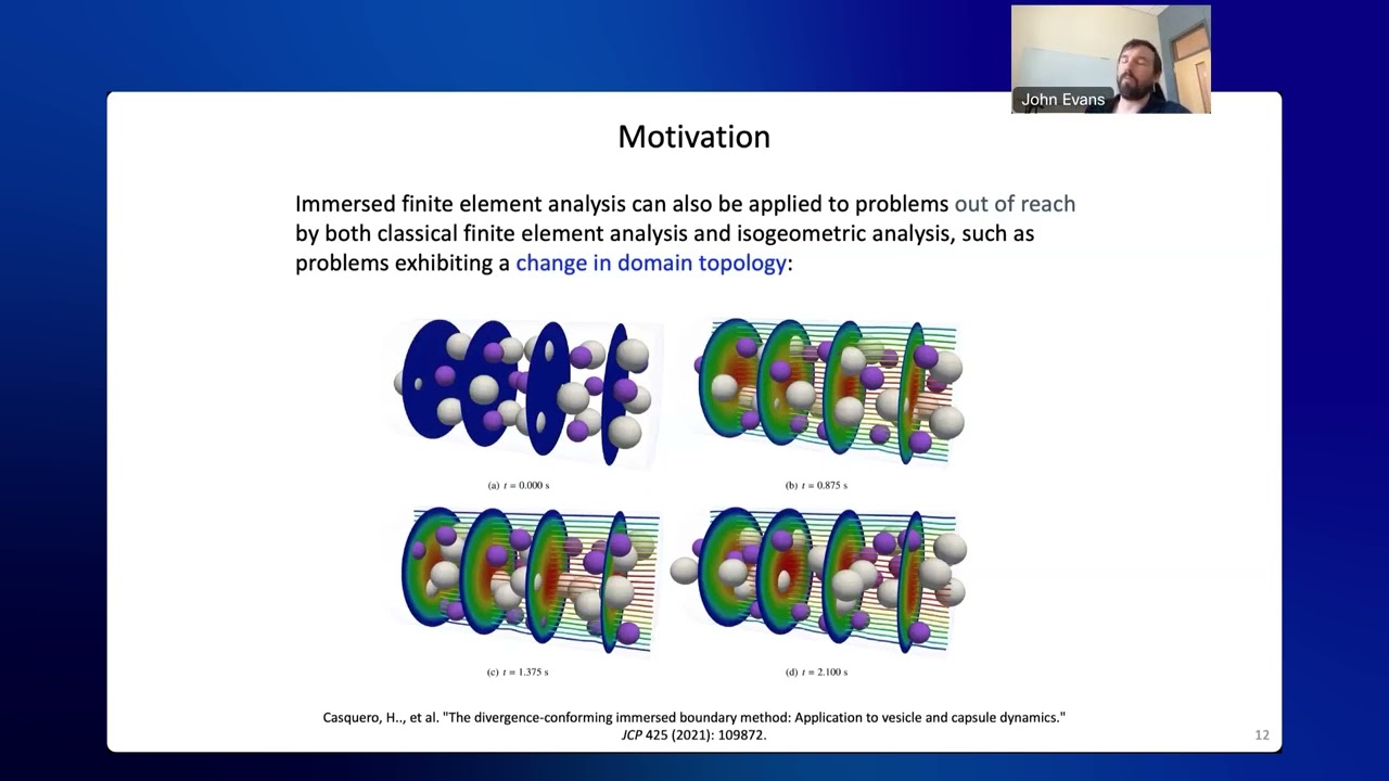Immersed finite element methods enable the simulation of physical systems out of reach by classical finite element analysis, and they also streamline the development of powerful shape and topology optimization technologies. However, the development of an immersed finite element analysis code is a daunting and burdensome task even for domain experts. This talk introduces a novel approach to immersed finite element analysis that dramatically reduces implementation complexity. Our method begins by interpolating finite element basis functions defined on a non-body-fitted background mesh onto a Lagrange basis defined over a body-fitted integration mesh. These interpolated basis functions are then used to perform immersed finite element analysis. Crucially, they can be represented locally using Lagrange shape functions via Lagrange extraction operators. This structure allows a classical finite element code to be converted into an immersed finite element code with minimal modifications. Specifically, the only additional ingredients required are: the Lagrange extraction operators, a connectivity array mapping local to global degrees of freedom, and the ability to evaluate the background basis function approximations and their derivatives via the extraction operators. The same framework also extends naturally to immersed isogeometric analysis. The presentation will begin with an overview of the method, followed by a theoretical discussion on stability and convergence for a model problem. We will then demonstrate the methodâs effectiveness on a range of examples from structural mechanics and fluid dynamics. Next, we will introduce our open-source software that generates the necessary data structures, enabling immersed finite element and isogeometric analysis within the popular FEniCS platform. Finally, we will show how interpolation onto a body-fitted integration mesh can also be used to convert classical finite element analysis codes into meshless analysis codes based on the Reproducing Kernel Particle Method. This work is in collaboration with Jennifer Fromm, Ru Xiang, Han Zhao, and J.S. Chen (University of California San Diego), Nils Wunsch and Kurt Maute (University of Colorado Boulder), and David Kamensky (formerly University of California San Diego).