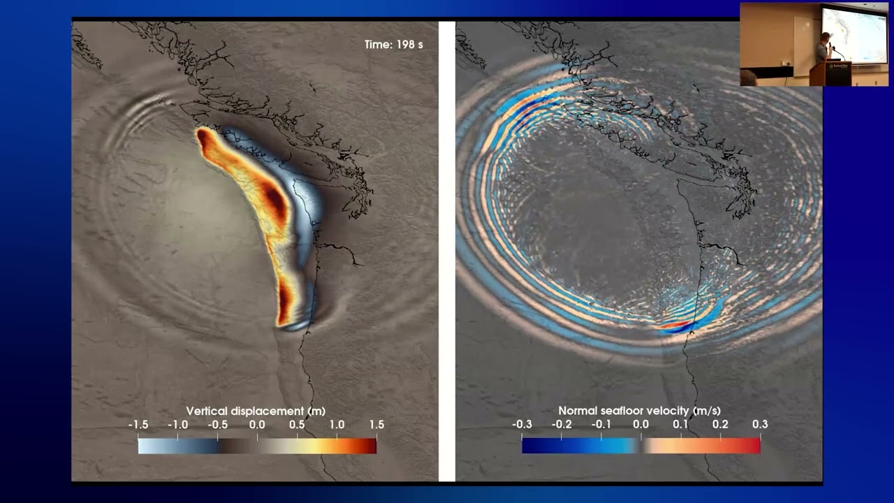 Stefan Henneking of UT Austin presented a Bayesian inversion-based digital twin that employs acoustic pressure data from seafloor sensors, along with 3D coupled acoustic-gravity wave equations, to infer earthquake-induced spatiotemporal seafloor motion in real time and forecast tsunami propagation toward coastlines for early warning with quantified uncertainties. The target is the Cascadia subduction zone, with one billion parameters. Computing the posterior mean alone would require 50 years on a 512 GPU machine. Instead, exploiting the shift invariance of the parameter-to-observable map and devising novel parallel algorithms, we induce a fast offline-online decomposition. The offline component requires just one adjoint wave propagation per sensor; using MFEM, the team scaled this part of the computation to the full El Capitan system (43,520 GPUs) with 92% weak parallel efficiency. Moreover, given real-time data, the online component exactly solves the Bayesian inverse and forecasting problems in 0.2 seconds on a modest GPU system, a ten-billion-fold speedup.