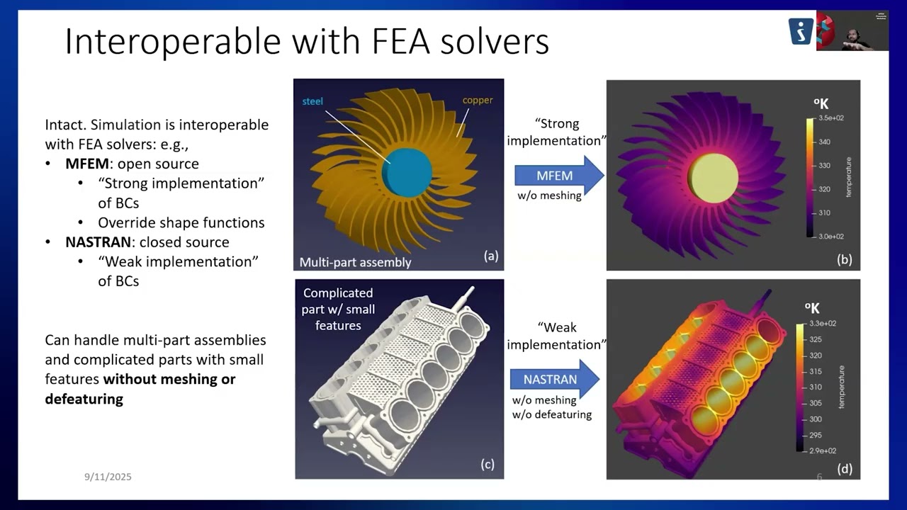 Sandilya Kambampati (Intact Solutions) discussed the integration of MFEM within Intact.Simulation, a high-performance platform for generative design and additive manufacturing (AM). Intact.Simulation virtually eliminates manual pre-processing by enabling mesh-free analysis of extreme geometries and heterogeneous material models through commercial plugins and cloud services. The project seeks to deliver scalable, high-fidelity finite element analysis (FEA) for AM applications by leveraging MFEMâs capabilities, including immersed discretizations, advanced integration schemes, and support for high-performance computing. Our initial focus is on feasibility: embedding MFEM to automate grid generation, quadrature enforcement, and boundary condition handling. The overall goal is to scale the solution to handle industrial-grade nonlinear and viscoelastic models on non-conforming meshes. The anticipated outcomes of this project include optimized lattice-structured components for aerospace, defense, and medical sectors, thus accelerating adoption of AM technologies via robust generative design and simulation workflows.