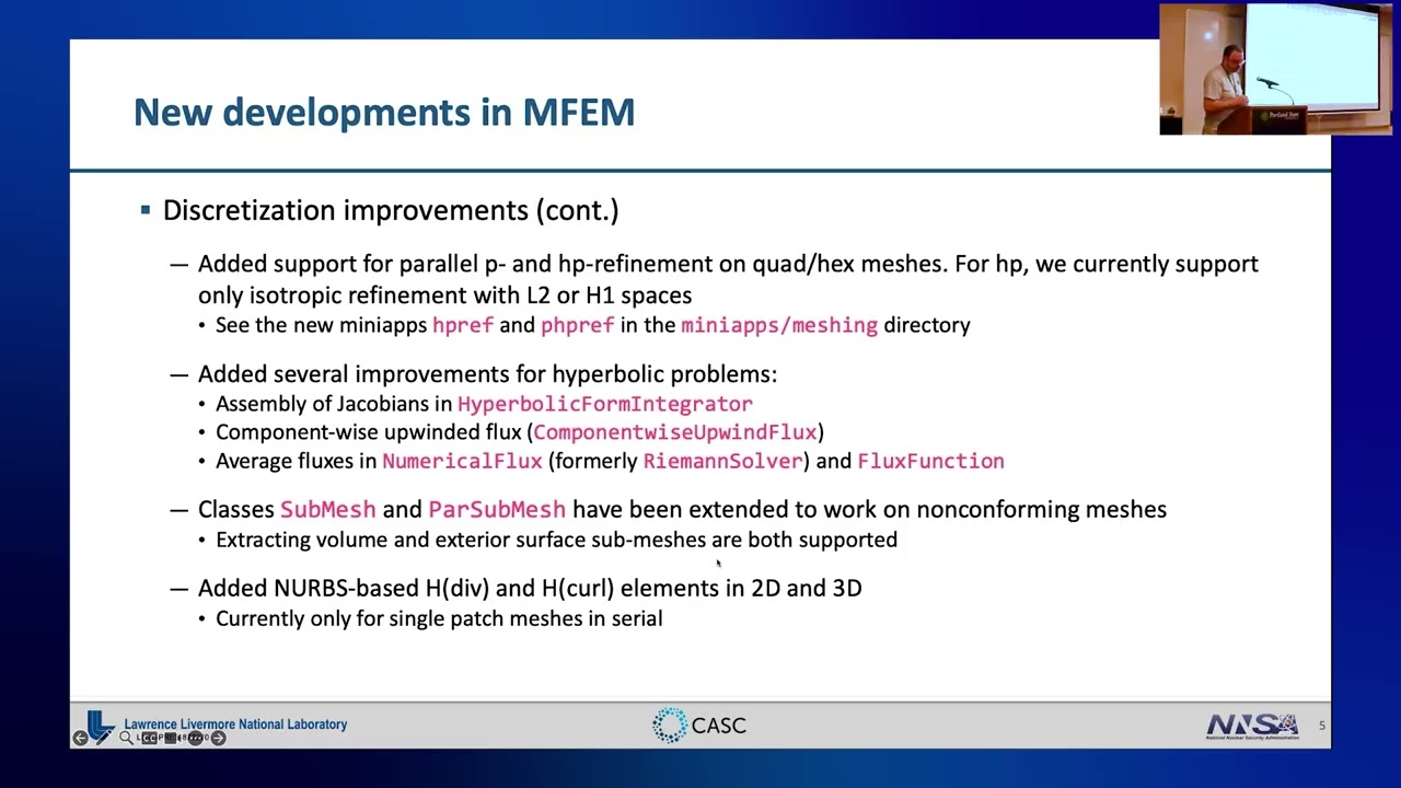 Veselin Dobrev of LLNL detailed the projectâs recent developments including C++17 requirements, meshing and discretization improvements, enhanced GPU support, and updated solvers.