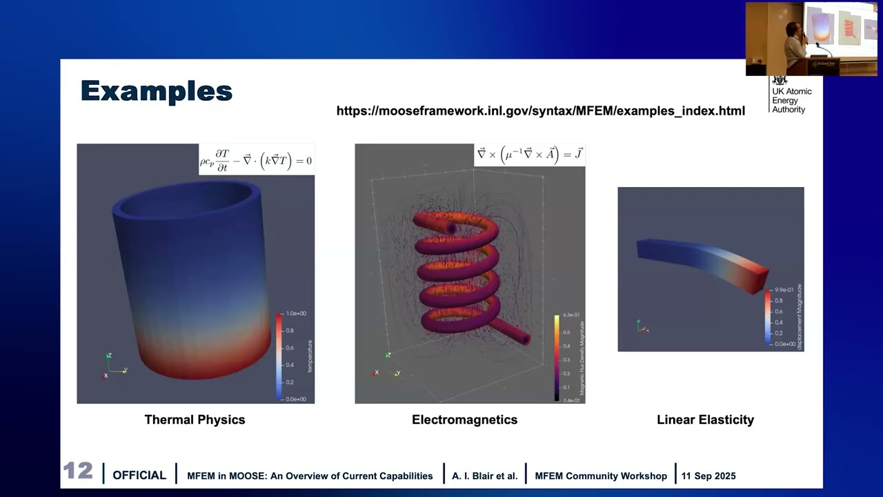 Alexander Blair (UK Atomic Energy Authority) gave this talk. In order to suitably assess complex components in challenging multiphysics environments, engineers must have access to performant, scalable simulation tools with simple user interfaces for design qualification. Earlier this year, support for MFEM as an available back-end was added to the large-scale open-source FE simulation framework MOOSE through a collaborative effort between UKAEA, STFC, and INL, enabling MOOSE's extensive user community to assemble and solve FE multiphysics problems on GPU architectures with MOOSE for the first time. In this talk, he presented an overview of MOOSE's current MFEM capabilities, show examples tackling thermal, electromagnetic, and solid mechanics use-cases, and outline our future plans for extending MFEM support in MOOSE for non-linear problems.