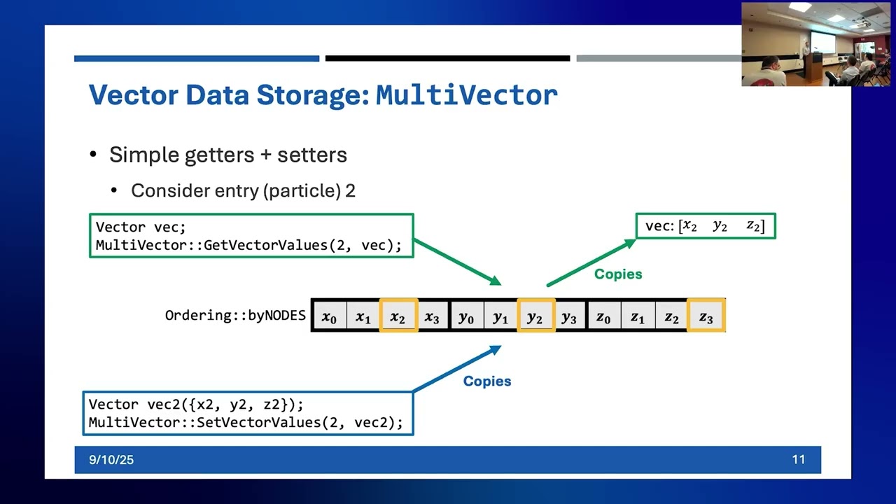 Joseph Signorelli (University of Illinois at Urbana-Champaign) discussed particles in MFEM. Accurately and efficiently modeling billions of particles computationally at-scale is essential for research in a wide range of fields such as electromagnetics and fluid dynamics. This talk introduced a new scalable particle tracking framework in MFEM. Key features are discussed including (i) support for an arbitrary number of âfieldsâ (vector data of any vector dimension), âtagsâ (integer data), and a global identifier associated with each particle, (ii) rebalancing of particle data across MPI ranks, (iii) seamless integration with existing MFEM data structures such as Vector, making it easy to leverage GPU acceleration, and (iv) IO functionality for visualizing particle trajectories in GLVis and ParaView. Example usage was demonstrated through new and improved miniapps, including an electromagnetics example and a new incompressible Navier-Stokes particle solver.