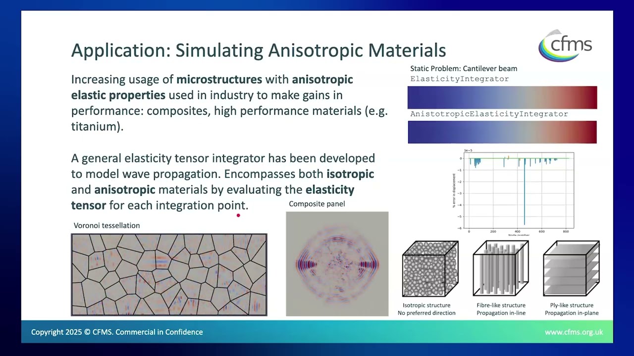 Matt Chandler (CFMS Services Ltd) presented the Bounce solver. In ultrasonic non-destructive evaluation (NDE), components are inspected using high frequency elastic waves to determine fitness for service without causing damage or destruction in the process. This is a highly valuable tool for many industrial applications: in the aerospace and energy industries, bespoke components are produced for use in situations where safety is critical. Technicians must therefore have a high confidence that any flaws which are introduced in manufacturing or during service will be identified, which requires large quantities of high fidelity data to qualify inspection methods. Further, with the increasing use of data-intensive processing methods such as machine learning, this requirement is compounded. As real flaws are rare, it is difficult and often infeasible to produce large amounts of data from genuinely defective components. CFMS have therefore been developing an explicit elastodynamic solver using MFEM to simulate ultrasonic inspection. Relying on the integration of MFEM with MPI, this has allowed the deployment of this solver for HPC-scale simulations, evaluating large models on the scale of metres, up to 1 billion elements. Additionally, materials with anisotropic elastic properties have been modelled to simulate inspections of high-performance materials including composite and titanium. Complex forcing profiles have also been implemented to study the interaction of an ultrasonic wave with arbitrary embedded flaws. In this talk, an overview of these applications was discussed.