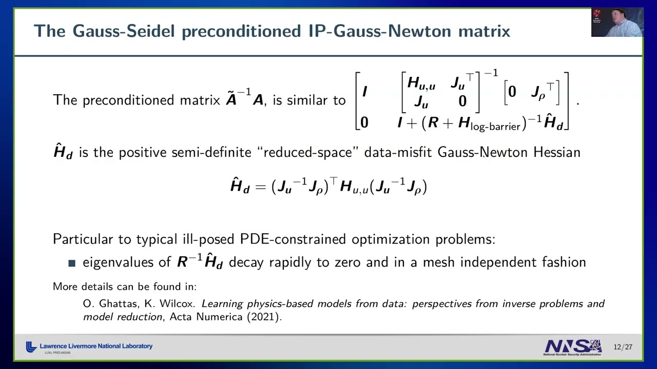 LLNL's Tucker Hartland presented a scalable method for large-scale PDE- and bound-constrained optimization. Such problems are a means to learn unknown aspects of PDE-based models. It is assumed that such model uncertainty is mathematically manifest in an unknown spatially distributed parameter field, Ï(x). Bound-constraints Ï(x)â„Ïâ(x) are a natural means to introduce additional knowledge of an unknown parameter field, e.g., nonnegativity of a diffusivity parameter field. Bound-constraints are, however, the source of additional computational challenges as they introduce complementarity conditions into the nonlinear optimality system. We utilize a robust, full-space, interior-point method to solve the optimization problem. In order to avoid the computational costs required to regularize the inertia of the linearized optimality system matrix, use a Gauss-Newton search direction. He discussed two related preconditioned Krylov-subspace solution strategies for said linear system. He showed that the number of preconditioned Krylov-subspace iterations is independent of not only discretization but also the ill-conditioning that notoriously plagues interior-point linear systems. He concluded with parallel scaling results on a nonlinear elliptic and linear parabolic PDE- and bound-constrained optimization example problems. The results were generated with a native implementation of the computational framework that makes extensive use of MFEM, a scalable C++ finite element library.